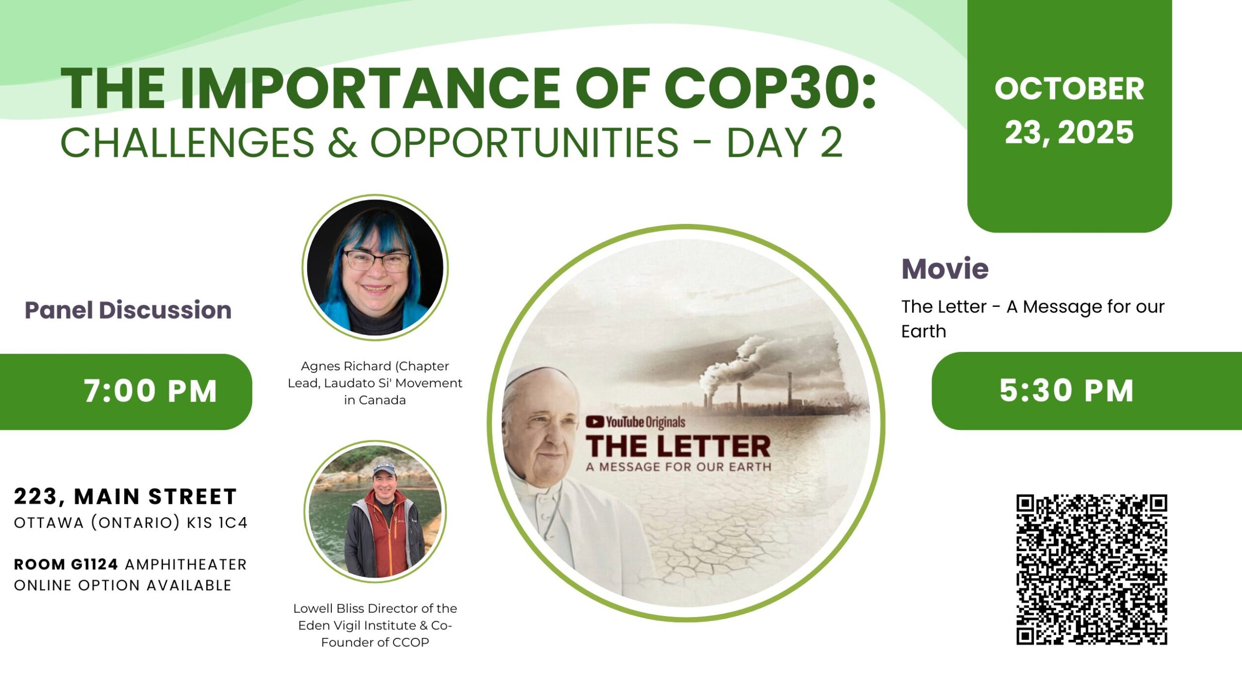 Join us for “The Importance of COP30: Challenges & Opportunities – Day Two.” The event will feature the screening of the film The Letter: A Message for Our Earth, followed by a discussion with Agnes Richard (Chapter Lead, Laudato Si’ Movement in Canada), Lowell Bliss (Director of the Eden Vigil Institute & Co-Founder of CCOP), a community delegate, and a School of Leadership delegate. Don’t miss this opportunity to engage with critical global issues and the voices shaping our future.