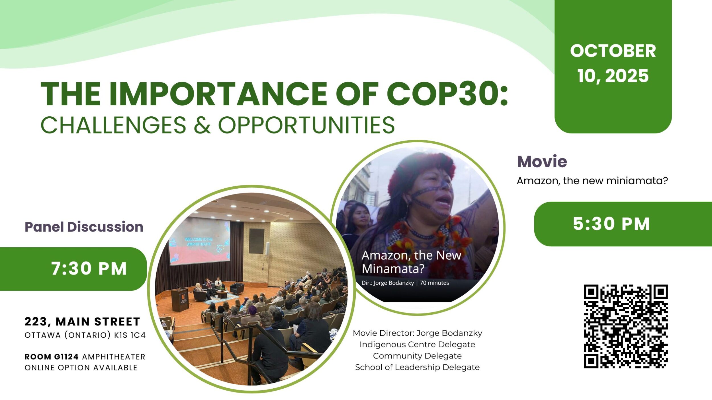 Join us for “The Importance of COP30: Challenges & Opportunities – Day One.” The event will showcase the film Amazon: The New Minamata by acclaimed director Jorge Bodanzky, who will also take part in an online panel discussion. He will be joined by representatives from the Indigenous Centre, the community, and the School of Leadership. Don’t miss this opportunity to engage with global issues and voices shaping our future.