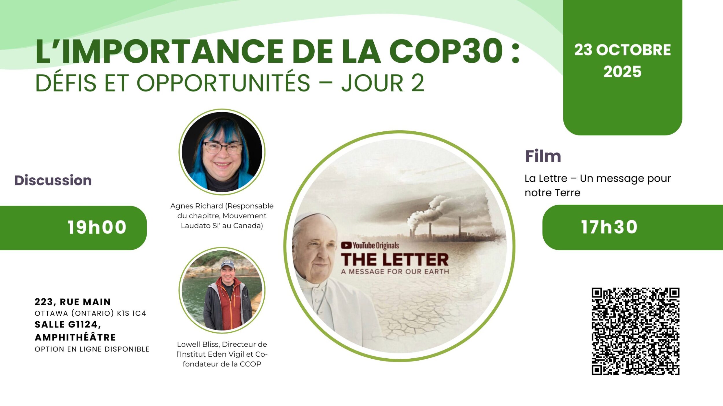 Joignez-vous à nous pour « L’importance de la COP30 : Défis et opportunités – Jour 2 ». L’événement comprendra la projection du film The Letter: A Message for Our Earth, suivie d’une discussion avec Agnes Richard (Responsable du Chapitre, Mouvement Laudato Si’ au Canada), Lowell Bliss (Directeur de l’Eden Vigil Institute et cofondateur du CCOP), un délégué communautaire et un délégué de l’École de Leadership. Ne manquez pas cette occasion de vous engager sur des enjeux mondiaux cruciaux et d’entendre les voix qui façonnent notre avenir.